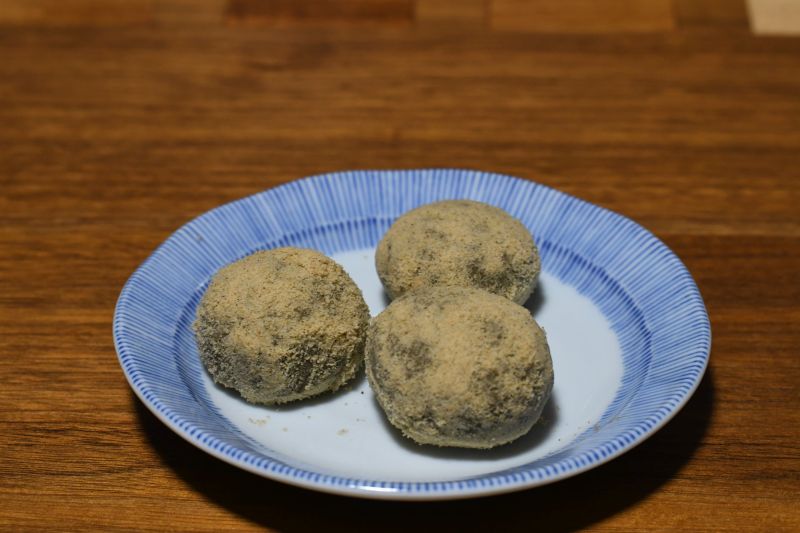 食後のデザート。インスタ先生に教わったもの。バナナをつぶして、きなこと抹茶とオリゴ糖少々を混ぜて団子にして、胡麻パウダーをまぶした。オリゴ糖と胡麻パウダーは私のオリジナルアレンジ。